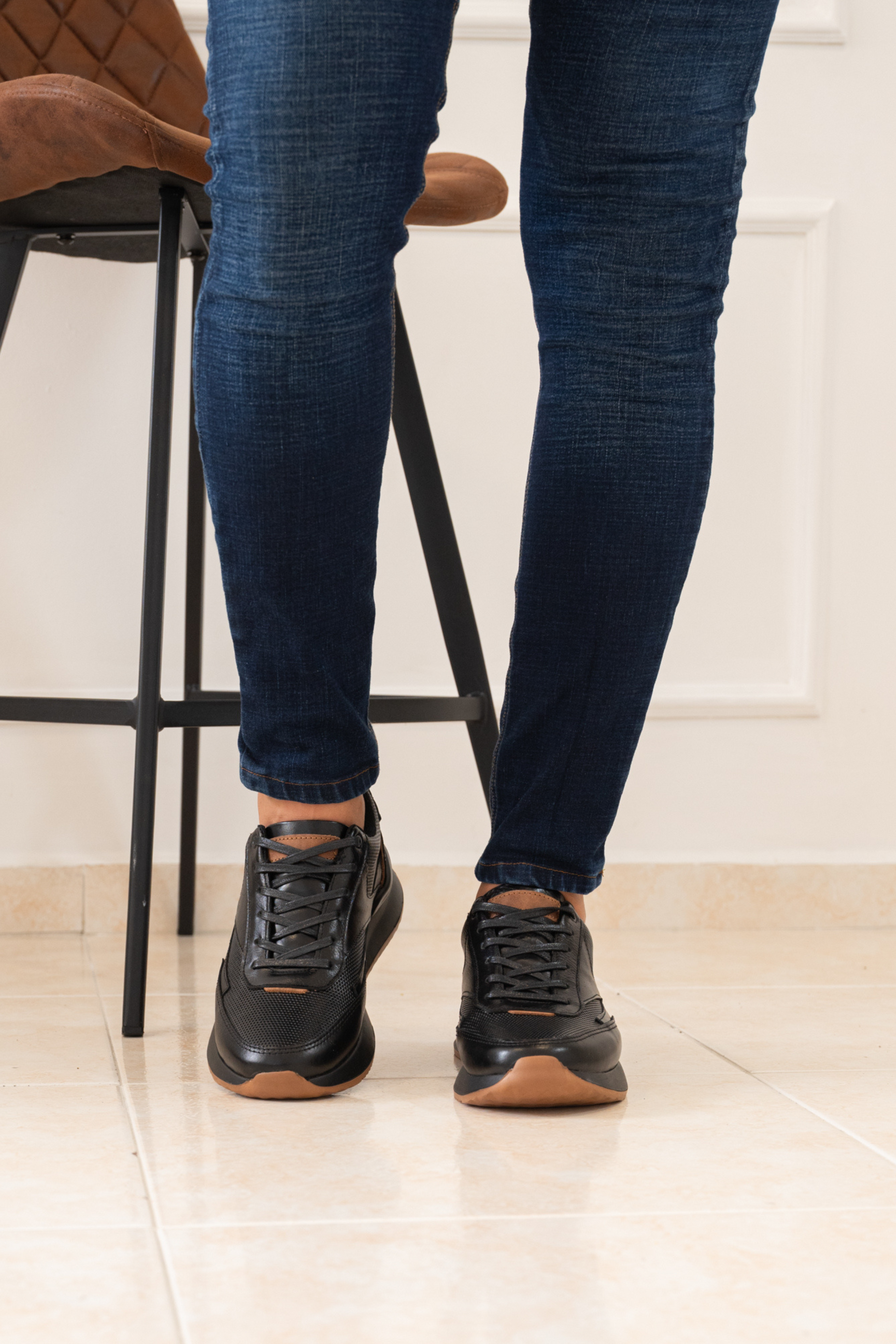 Un diseño que fusiona elegancia deportiva y distinción urbana. Elaborado en cuero genuino de alta calidad, su acabado negro profundo se complementa con sutiles acentos en tono miel que aportan carácter y exclusividad. La suela liviana de alto rendimiento ofrece comodidad y ligereza en cada paso, haciendo del Catania la elección perfecta para quienes buscan estilo, confort y versatilidad en un solo calzado.