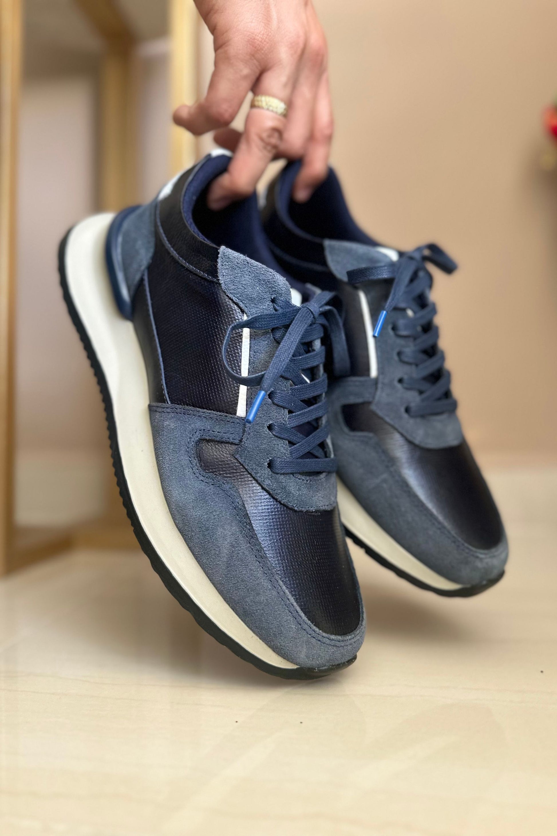 Tenis para hombre confeccionado en cuero carnaza de primera calidad, combinando tonos azul y gris que se adaptan a cualquier estilo. El material suave y flexible proporciona comodidad excepcional durante todo el día, mientras que su versatilidad lo hace perfecto para looks casuales o semi-formales. La carnaza de calidad garantiza durabilidad y un acabado premium que mejora con el tiempo. Diseño clásico con la referencia Bolonia que refleja elegancia y funcionalidad. Una inversión en calzado que combina confort, estilo y resistencia en cada paso.
